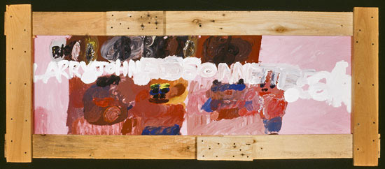 Fig. 2 Larry Bissonnette, “Paints Get Really Loused Up by My Signature so Both Art and Letters Learn to Cohabitate,” 1997. Courtesy of Douglas Biklen. In places, the letters appear partially smudged, as if the paint underneath hadn’t entirely dried and the new paint had begun to mingle with it. The short commentary reads: “Powered print treats painted images well as long as colors Larry selects match. Larry loves pink and purple because pressured painter gets to lighten stroke” (Biklen 2005: 176). It’s almost impossible to miss the “p”s and “r”s and “t”s—all of those inherently meaningless but nonetheless pleasurable, because patterned, sound effects. It’s also difficult to miss the attention to the activity of painting itself: the preference for lighter strokes and perhaps the sensory requirements for producing them. Bissonnette paints independently; he does not need the touch of facilitation, though he does need a kind of coach or “persuader to do great art when creativity is clashing with serious autistic stubbornness” (My Classic Life 2005)—a distinction to which I will return. The charged relationship between word and image, hinted at in a commentary already discussed—“my muralistic lettered view of life” (Biklen 2005: 182)— might, however, elude the viewer who is unfamiliar with Bissonnette’s life story. Presumed retarded, Bissonnette spent ten years, from age eight to eighteen, at the Brandon Training School in Vermont, an institution for special needs children. Later, he was incarcerated at the Vermont Psychiatric Hospital in Waterbury. In the documentary, My Classic Life as an Artist, Bissonnette, who wrote the film’s screenplay, reflects on his experience: