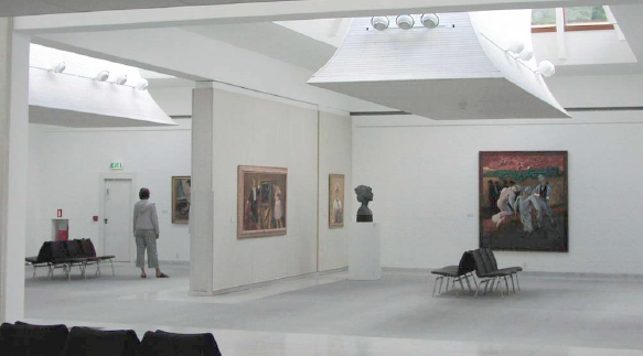 an aesthetic distance. Fig. 2: A gallery at the North Jutland Museum of Art, Denmark, designed by Alvar Aalto. Putting art at the service of life to transform life has been a goal of modern artists. So removing art from the museum has been a passion for much of 20th-century art. (Of course there has been an opposite passion on the part of many artists to get into the museum so that their art can be noticed.) Art became immured in the museum only in the 18th and 19th century, since museums are a relatively recent institution. Before that, much art lived in public churches and public squares. Other art lived privately sequestered away in aristocratic estates and gardens. In the museum labels and posters use art history to broaden the experience of the artworks. This opens a context for the artwork to relate to other artworks, but this is often a confined space and a safe horizon. Or at least it used to be. Now art history is breaking down barriers by relating artworks to social movements, revolutionary impulses, repressed feelings and desires, and other wider horizons that may scare the connoisseurs of comfortable history. Still, reading descriptive labels remains a quiet activity [2]. Compare