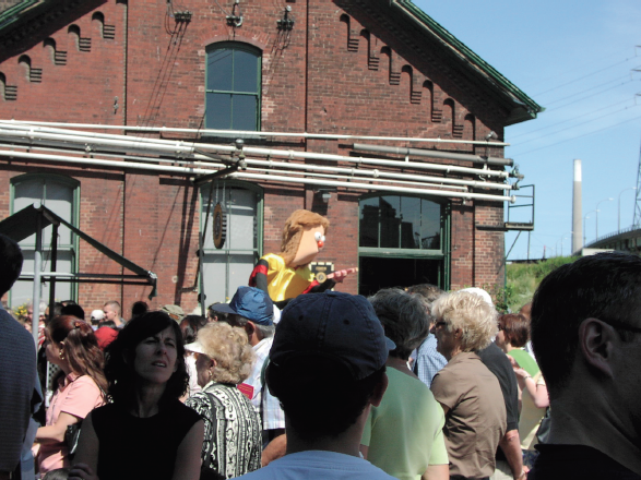 within, not just contemplated? Fig. 3: Street theater in Toronto, Canada. Outside the museum we run into obstreperous art that glories in denying reverential distance – guerrilla theater, performance art, some public installations – yet these often bring the museum with them, putting invisible lines around themselves as works to be contemplated. It is so easy for the work or for the audience to adopt an aesthetic attitude that insulates the audience from challenge to their beliefs, attitudes, or bodily orientation. Trying to overcome this distance can force the artworks to become more and more extreme, which in turn encourages still more distance on the part of the audience. Architecture has the advantage that it can force us to adapt to its spaces and orientations. We cannot remain in a purely contemplative attitude when we are actually within and challenged by puzzling spaces, heights and depths, colors and volumes. We have to move; we have to organize perceptions and synthesize a bodily image of where we are and what we can do within the building. So the architect has more power, and Arakawa and Gins intend to use that power, to be more than the creators of objects for contemplation. This is not to deny that there are many buildings created to be objects for contemplation, with aesthetic façades that photograph well and hide thoroughly conventional spatial patterns. Much architecture is designed to be consumed easily, so as not to challenge familiar activities and goals. Such buildings fit nicely into the flat media that display and publicize them. Better architecture can transcend and challenge familiar activities and intentions, making them something more than they had begun to be [3]. Arakawa and Gins want their buildings to be more than displays. But for this they have to be lived in, not displayed at a distance. The museum, love it and leave it. One tactic employed by aspiring architects has been to use museum exhibits to achieve status and publicity. The 1932 exhibition of The International Style at the New York Museum of Modern Art was crucial in bringing new European modes of building to the United States. Later curators attempted to duplicate that effect with exhibitions on Postmodernism and on Deconstructive Architecture. Arakawa and Gins have had their own dramatic and successful museum shows, but such exhibits have an inherent defect: they turn their work into objects to be contemplated. It has been a challenge for Arakawa and Gins to escape the museum and build environments for daily living in which people will actually live, rather than just visit to see a curious possibility in which someone else might someday live. More than exhibits are needed to get their work influencing people's