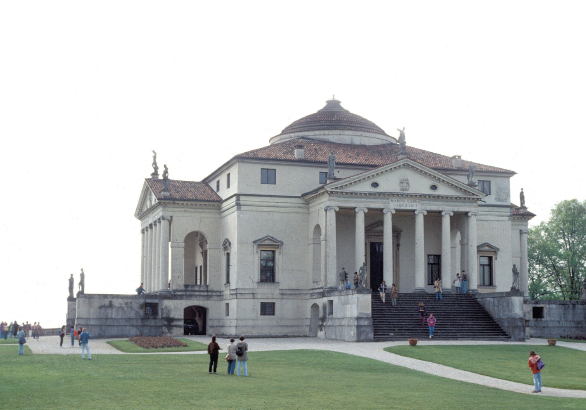 self-promotion book [4]. Fig. 5: Palladio's Villa Rotonda (1571), outside Vicenza, Italy. Arakawa and Gins have tried to find funding for buildings that would prove the effect of their architectural surrounds on people who live there rather than visitors who wander through them. There is a chicken and egg problem when there are no examples of people who have lived in Arakawa and Gins' proposed environments. This lack of long-term examples requires them to find other ways to publicize the new possibilities, and to write and argue to change social norms about what kind of architecture is appropriate for today's daily lives. Social Norms for Buildings It is important to recognize the way social norms govern our engagement with architecture. We identify a building as for a certain purpose. We act and hold our bodies differently in a courtroom or a church than in our living room or at a park. Those norms are passed along over time, and they can change, though usually they change slowly. For the most part, these norms are taken for granted, shaping the background for our activities. Arakawa and Gins want what they call the architectural surround to