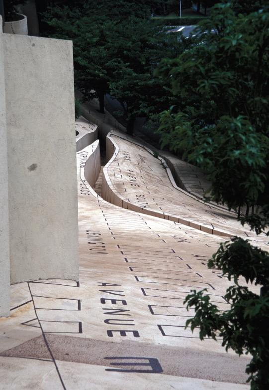 on the undulating surface. Fig. 8: Map of Manhattan avenues and streets overlaid on incised paths at Arakawa and Gins's Yoro park. Arakawa and Gins design spaces and buildings that provide multiple and intersecting sets of horizons and orientations. Each pivots off the other; their purpose includes but goes beyond creating new meaning; they bring you to see the spaces as richer than they seem at first, and by creating uncertainty they want to force more precision in the ways you inhabit and move in that multiply structured space. This is not unlike the way metaphorical language in poetry can make us more sensitive and precise about using the echoes and systems of ordinary words. Arakawa and Gins are trying to make bodily readjustments amid multiple systems of reference that cross each other to create new kinds of incarnated maps of daily activity. Once again, though, this can only be achieved if the bodily activity is real and not something contemplated from a distance, or something experimented with as a game in a safe and isolated environment like a museum or a display.Self-Aware Living In a book and website project, Sprawling Places