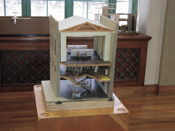 make a digital/home experience more active and "physical"? Fig. 10: Wooden architectural model of a student project at the University of Texas School of Architecture. Architects use models to present their designs. But with a wooden model it is difficult to avoid the god's-eye view from above. Digital models presented can show on a screen a model of the building's interior from different points of view. This can help. But if the architect's wooden model is replaced by the digital fly-through, which is literally disembodied, the experience still remains a kind of omnipresence that lacks precisely the kind of physicality that Arakawa and Gins are trying to influence. The screen focuses as a single landing site, and a computer mouse makes all motion a flick of the wrist. There is no effort, no need to reorient one's body. So a digital re-creation of one of Arakawa and Gins's buildings using ordinary screens would not accomplish their goals. It would again turn the building into a spectacle and lose the effort of living in this new surround. The usual digital presentation faces you, it does not surround. Some digital presentations can surround you physically. A "Cave" uses three wall-sized screens, sensors to detect bodily motion, and computers to alter the images on the huge screens in response to the viewer's motion [20]. In such a room you could feel you are inside a space designed by Arakawa and Gins. Peripheral vision and the ability to walk around and see different views would allow some of their architectural procedures that affect orientation and horizon. But, however much improved, the effect would still be mostly visual. All this makes it difficult for Arakawa and Gins's architecture