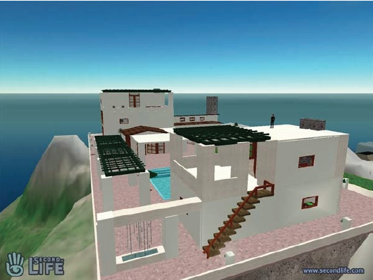 some art out of the museum, would put their architecture back in. Fig. 11: Image 11: Digital architecture presented in the virtual world Second Life, where the "camera" can give an aerial view and move around the player's avatar. (Image copyright Second Life, all rights reserved). A web page is not enough. A virtual world like Second Life could be a way to make a digital presentation of Arakawa and Gins's architecture. However Second Life is also largely disembodied. It is purely visual and it is not fully first person. That is, the "camera" point of view floats around a person's avatar and can be made to back off and see what is behind and above, more than the embodied avatar's limited cone of vision could include. There is also no sense of difficulty dealing with slopes or rough surfaces. In addition, one can fly and avoid all the surface geometry. There are reasons for these features in Second Life, and one can move around inside buildings, but the overall effect still reduces the experience of architecture to scenographic spectacle. Is there a way to bring activity and physicality into a digital experience? The closest we could come, given currently available technology, would probably be to use the graphic potential of digital games, but arrange that one's avatar would be less bouncy and renewable than in games. Some difficulty and fatigue factors could be introduced, making motion less easy when there were slopes or narrow spaces. There could be an enforced first-person point of view, as in some shooter games, where participants only see what they turn their head to see, and have to choose what to concentrate on and what kind of visual landing sites to take note of, so that the surroundings are revealed piece by piece, perspective by perspective. This would allow procedures that involve multiple horizons and disorientation to have effects which would be missed in the usual digital fly-throughs that allow one to see too much at one time and so avoid the physicality of attention. Even so, such a digital presentation would remain on the screen and does not challenge the viewer's bodily inhabitation of space. A further step would be to feed the digital imagery into virtual reality equipment such as 3-D goggles or a Cave, with controls that have varying resistance, so that the viewer sees a limited and changeable perspective and experiences some muscular sensation of difficulty. These reflections on the usability of various media for publicity show that Arakawa and Gins's work demands more than photos or a screening. Physical visits are needed, but shared bus trips to their works remain visits to the museum. Perhaps what would help would be to have samples of their work inserted into people's already built daily architectural surroundings -- not representations, but actual samples. Interventions in Existing Homes Would there be ways of adapting Arakawa and Gins's architectural procedures to already existing houses or apartments? If the creation of an architectural surround with their necessary qualities demands completely new construction, this limits their possible impact and puts their ideas at the mercy of too many external forces and institutions. Could Arakawa and Gins bring some of the qualities of their new constructions into already built environments? [21] Imagine, for instance, rugs that have patterns and bumps that would accomplish some of the disorientation and reorientation found in their more three-dimensional creations. Imagine color patterns on walls and floors and ceiling, perhaps duplicating some of the effects from the Bioscleave House where color and texture rotate about from room to room. Imagine furniture that refuses to sit quietly in the background, or that forces walking routes through a suburban living room to twist or use ramps. Imagine mirrors and colors and inserted curtains reconfiguring spaces
